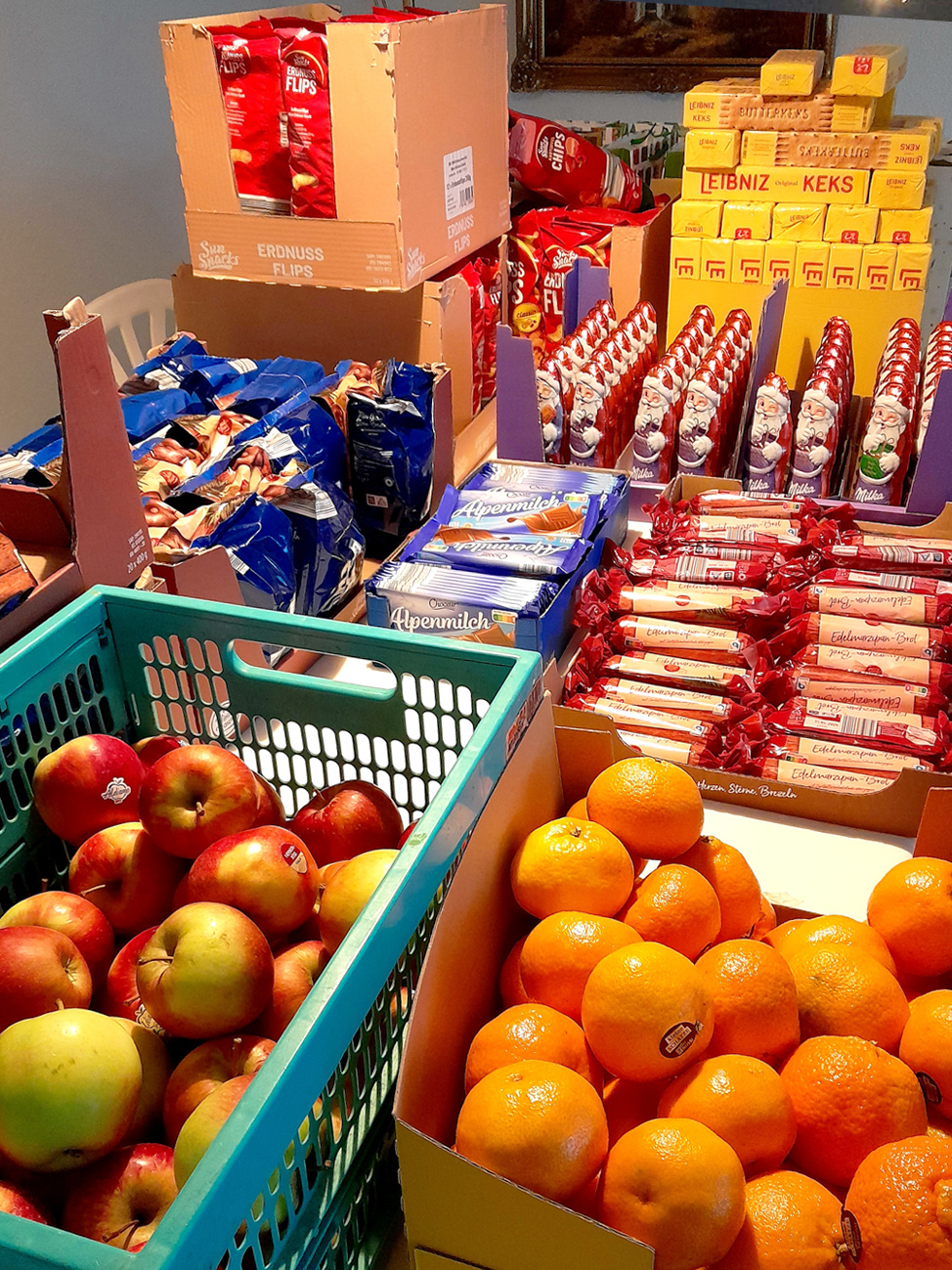 Im Anschluss haben wir uns um den Weihnachtsbaum versammelt und die vorbereiteten Tüten mit allerlei Süßigkeiten und Obst verteilt. Herr Theisen hat die restlichen Tüten für die erkrankten Kinder mitgenommen.